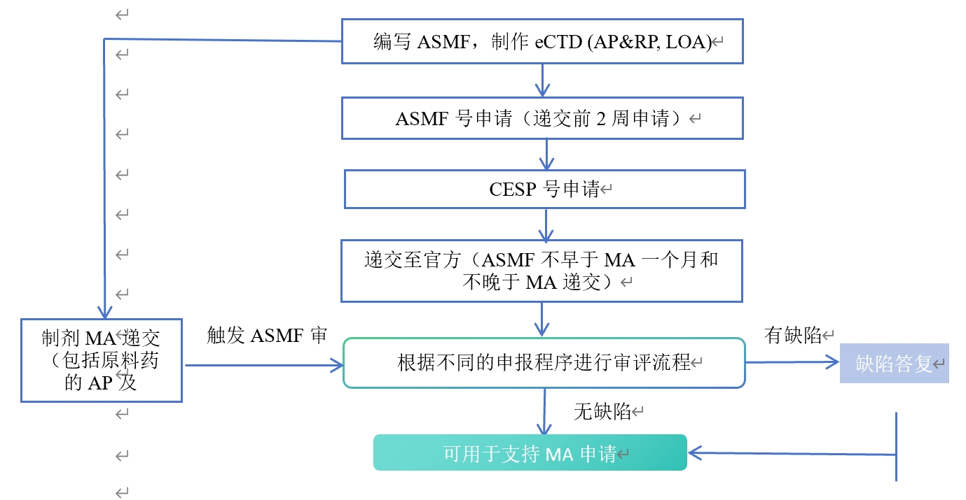 ASMF的申报必须与使用该原料药的制剂MA申请进行关联(不早于MA一个月和不晚于MA递交),原料药的生产商通过开具授权信(LOA)实现与制剂上市许可申请的关联审评,即ASMF的审评程序和相应的制剂上市许可申请的审评程序是一致的。